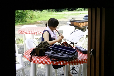 気持ち良いので、みんな外で練習. |