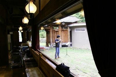 宿泊棟の1つ、ログハウスの前で練習. |