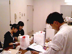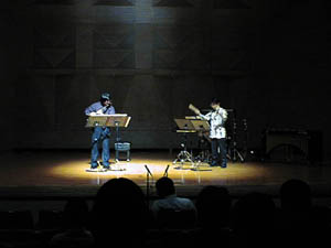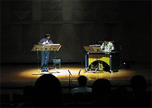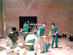 今回の舞台では伊勢君の提案を取り入れ、私としては初めて照明にも凝ってみました。打楽器の世界ではごく普通のようですが、初めての体験にちょっと緊張。第一譜面が見ずらいのですね、暗くて。それに、前方からのスポットが当たるわけですから、フルートから反射された光が譜面に綺麗な幾何学模様を投影してしまいます。お客さんの顔も見えない。そのお陰で音楽により集中することは出来ましたが・・・・・。 |