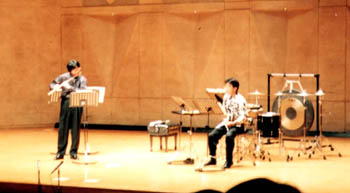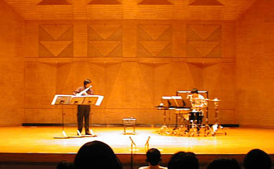 「Thoughts」と名付けられたこの曲も現代曲の一つです。当夜唯一のヴィブラホンを使用しての演奏、打楽器ではありますがちゃんとして音程がありメロディも担当します。古典のようにわかりやすく親しみやすい曲で聴衆の人気も高く「こういう古典的な響きがかえって新鮮に聴けた」という感想も頂きました。ブィブラホンって良く響きますね、コーン、と軽く一叩きするだけで会場に音が充満します。モーター駆動によるヴィブラートは響きすぎてしまうので遠慮していただきました。 |