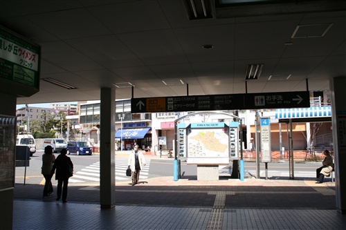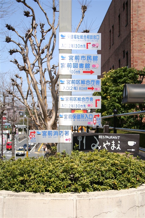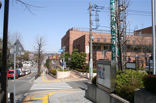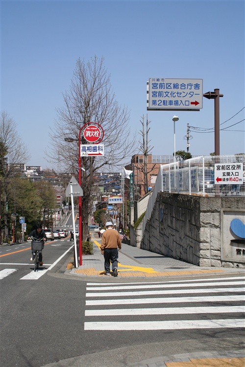 改札を出て右を向いたところです. 外へ出て横断歩道を渡ります. 北口からバス利用も出来ます. 「宮前区役所」で下車してください. |