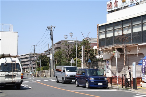 横断歩道から左方向に見える交差点を 右折(銀色のワゴンの後ろ)です. 現在屋上に「焼肉」と書かれた看板のある建物は、建て替えられて1階・2階に商業施設のあるマンションになっています。下記画像を参照下さい。 |
