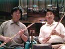 フルートの席で首席奏者の森君と記念撮影。シャッターを切ったのはやはり札響フルート奏者の清水さん。何年振りかにお会いして静かな方だと思っていたら・・・・・・コンピータの話を始めたら突然生き生き。マックでインターネットを楽しんでおられるとのことです。翌日にはこのHPから私の娘の画像を印刷してきてびっくり。仕事がいっそう楽しくなりました。クラリネット奏者の渡部さんもマック使い。今までなかなか話す機会がなかったのに、インターネットのおかげで和気あいあいです。