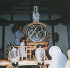 JR飛騨古川駅からほど近い場所に、「起こし太鼓の里・飛騨古川会館」や「飛騨の匠文化館」などがあり、その近くには飛騨の古い町並みを見ることが出来ます。まずは起こし太鼓を見学。明日の演奏会で演奏する「組曲・古川って好き」の「起こし太鼓」と言う曲で、起こし太鼓(又は大太鼓)を使いますので打楽器担当の伊勢君は特に興味津々です。実際にみんなでかわるがわるたたいてみました。お腹の底に響きわたるとても素晴らしい音がして一同、ふぅ〜む、と感心、やはり日本人なのだと今さらのように感じ入ってしまいます。後学のためにと、今回の旅行に連れてきた私の娘桃ちゃんも、私と一緒に起こし太鼓をたたいてみました。子供ってこういう鳴り物が大好きですね。はしゃぎながら、しかし熱心にたたいていました。上の写真が起こし太鼓です。
