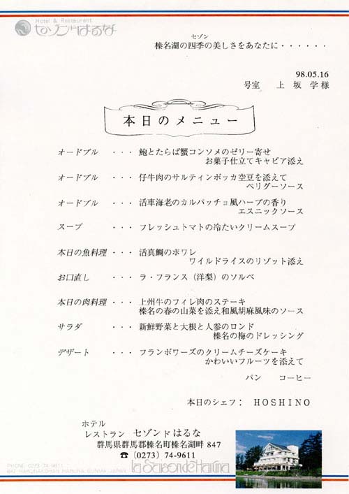風光明媚で知られる群馬県榛名湖畔にある「ホテル・セゾン ド はるな」では、毎年5月〜12月の8月を除く毎月「四季のコンサート」を開催しています。会場はホテルのロビーで、聴衆は主に宿泊のお客様です。演奏会終了後、演奏者と一緒にディナーを楽しむという趣向です。 今回で73回目、年7回の開催ですからその歴史は10年を越えます。ホテルの社長さんの「美味しいディナーを食べがてら、1泊2日で観光に来てよ」という言葉に乗せられ5回目の出演となりました。 まずはプログラムをご覧下さい。共演は毎度お馴染み、志田(Fl)さんと近藤(Pf)さんです。 |