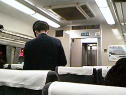 これはいい、車より楽チンです。何せ、飲み食い自由、喫煙OK、それにシートはリクライニング。飛行機のエコノミーより断然快適です。特急列車ですので、当然検札が来ます。下の画像はその時の様子です。
